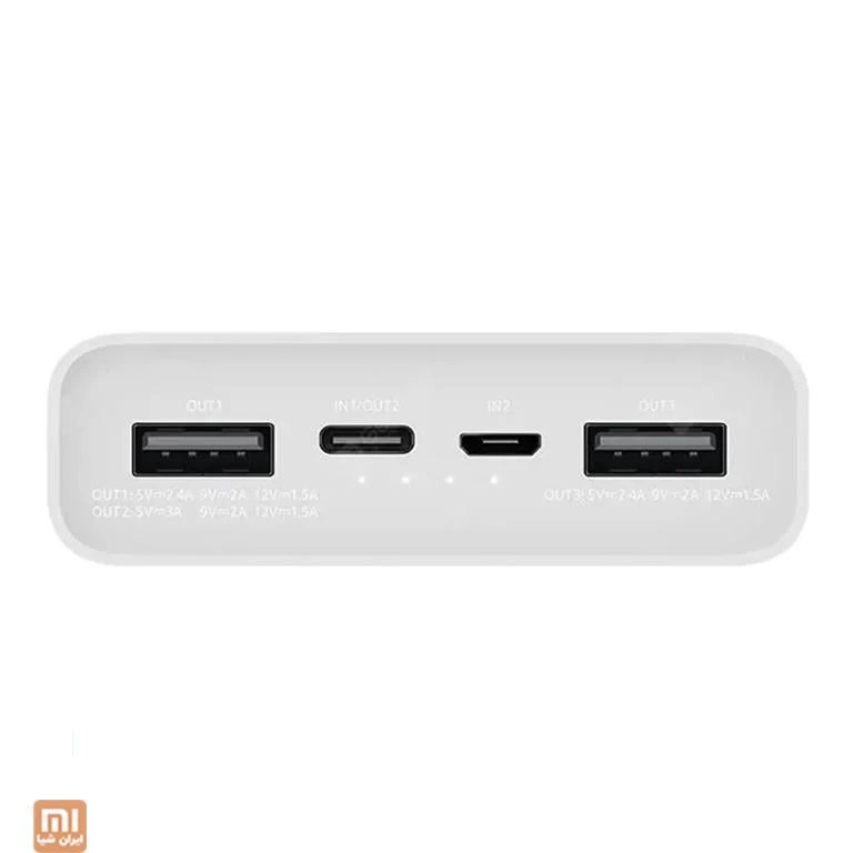 پاوربانک 20000 میلیآمپر شیائومی ورژن 3 دارای 3 پورت خروجی و 2 پورت ورودی است. به عبارتی دو پورت خروجی از نوع USB-A، یک پورت ورودی از نوع Micro-USB و یک پورت USB-C (پورت تایپ سی) که هم ورودی و هم خروجی میباشد بر روی بدنه این دستگاه تعبیه شده است.